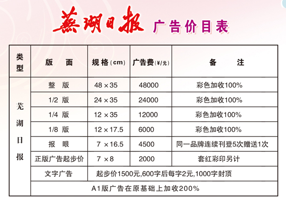》是中共芜湖市委机关报。周七刊,对开八版。具有权威性、指导性、服务性和贴近性。《芜湖日报》2004年元月1日扩版以来,容量加大版面栏目丰富多彩可读性增强,主要栏目和版面有:今日关注、百姓故事、党报热线、焦点透视、经济观察、市民心声、每月论坛、民主与法制等。