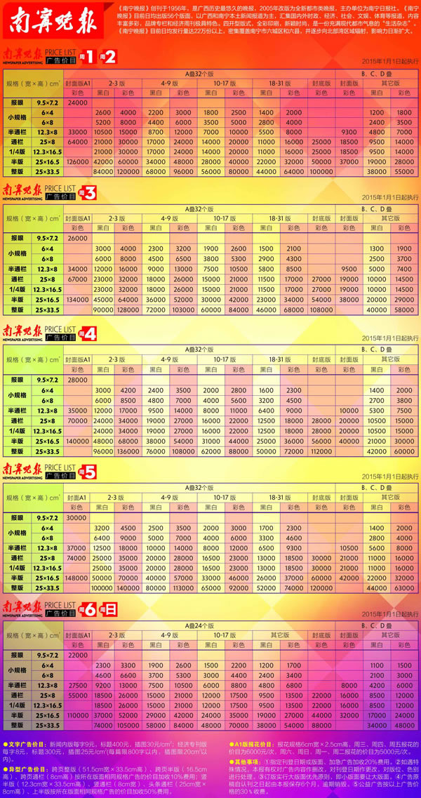《南宁晚报》为对开大报,周7刊,每天12大版,其中有4-6个彩版。她是中共南宁市委机关报,又是晚报,创刊于1956年,是广西历史最悠久,发行量最大、最具权威性和影响力的一家晚报类新闻媒介。立足南宁,面向全国,日发行量13多万份,读者层面涵盖机关干部、知识分子、工人、学生、商业职工、个体经营者、个体经营者、居民等。
